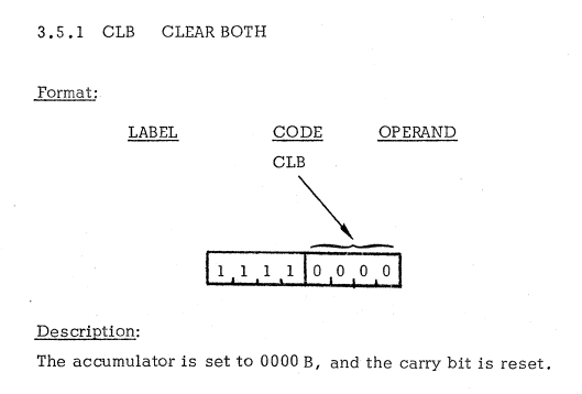 | 7 | ACCUMULATOR INSTRUCTIONS | CLB | Clear accumulator / アキュムレータをクリア |