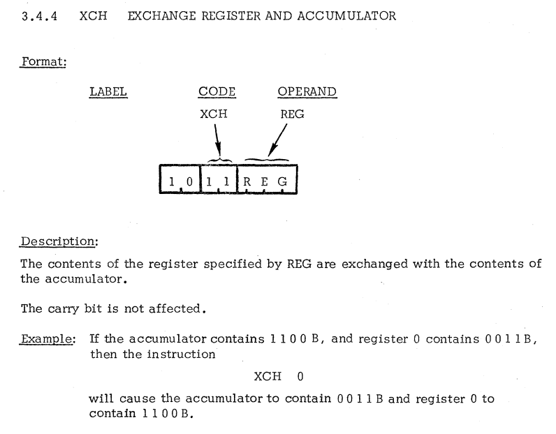 | 6 | INDEX REGISTER TO ACCUMULATOR INSTRUCTIONS | XCH | Exchange index register with accumulator / インデックスレジスタとアキュムレータを交換 |