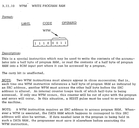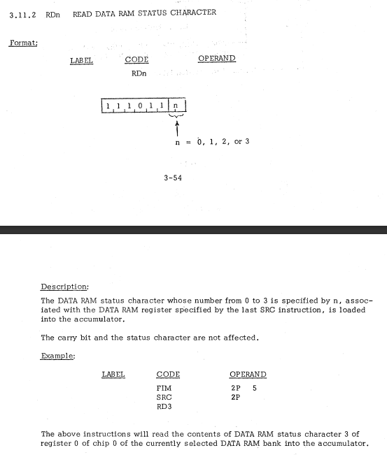 | 45 | I/O AND RAM INSTRUCTIONS | ADM | Add data RAM to accumulator with carry / キャリーを伴ってデータRAMをアキュムレータに加算 |