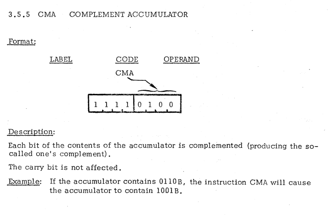 | 11 | ACCUMULATOR INSTRUCTIONS | CMA | Complement accumulator / アキュムレータを補完 |