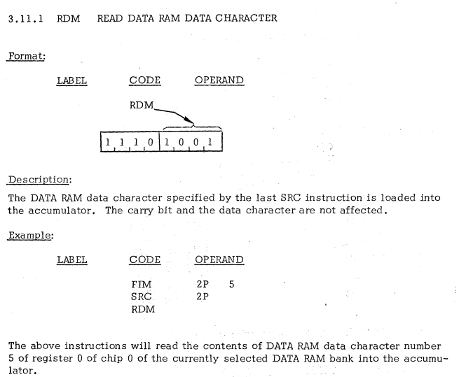 | 39 | I/O AND RAM INSTRUCTIONS | RDM | Read data RAM data character / データRAMデータ文字を読み込む |