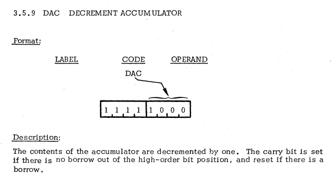 | 15 | ACCUMULATOR INSTRUCTIONS | DAC | Decrement accumulator / アキュムレータをデクリメント |