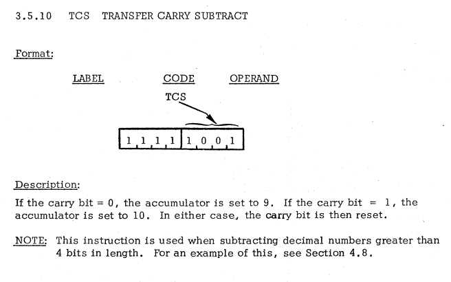 | 16 | ACCUMULATOR INSTRUCTIONS | TCS | Transfer accumulator to carry / アキュムレータをキャリーに転送 |