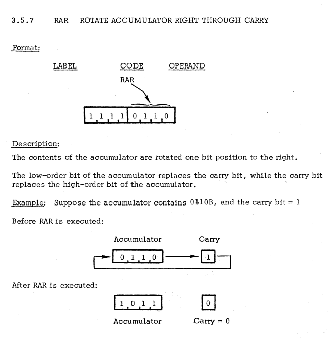 | 13 | ACCUMULATOR INSTRUCTIONS | RAR | Rotate accumulator right / アキュムレータを右にローテート |