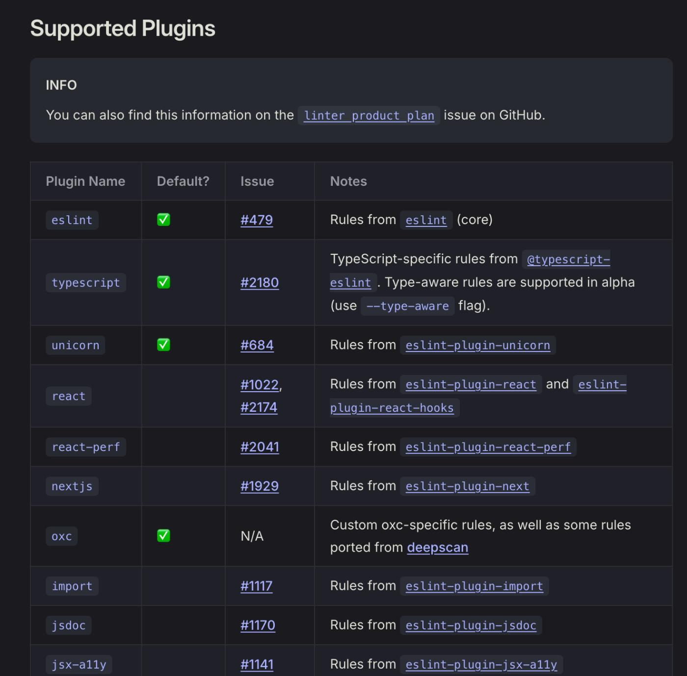 そりゃそうですよね.と思ったのも束の間公式ドキュメントのSupported Pluginsに以下の通り書いてありoxlintプラグインで移植されているため, これらを使うとさらにESLintプラグインを減らせそうです.