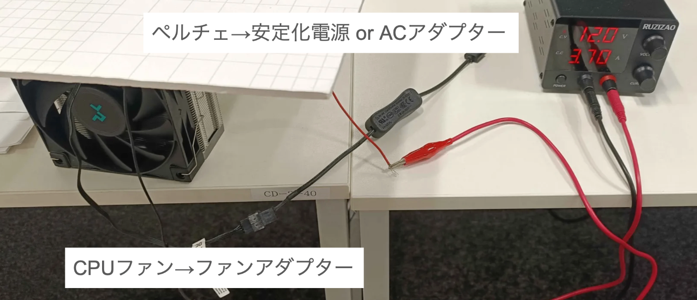 まず、ペルチェ素子に対応した12V電源を用意します。今回は安定化電源を使用しました。