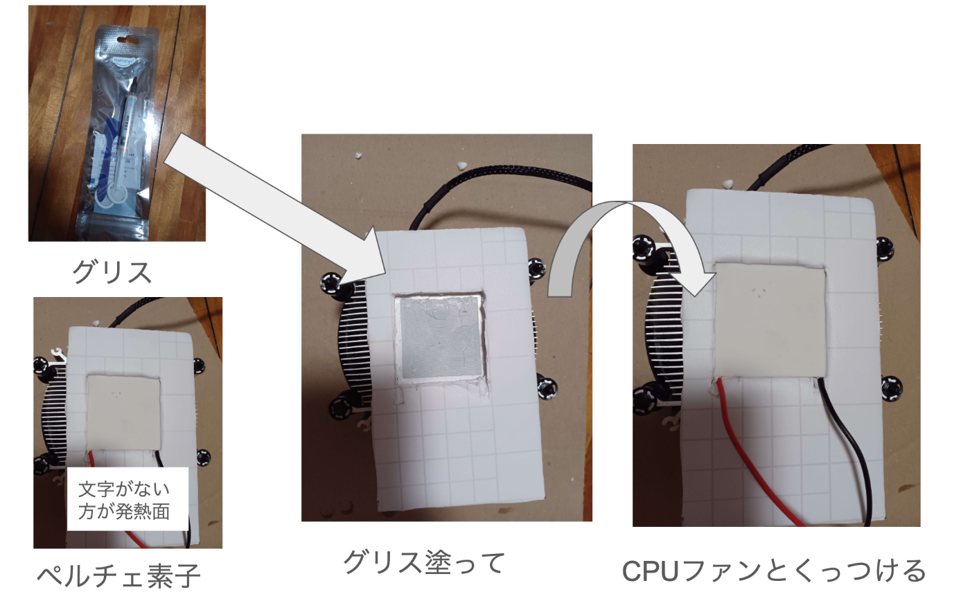 ペルチェ素子単体では効率よく冷えないので、CPUファンとヒートシンクでペルチェ素子を挟む必要があります。