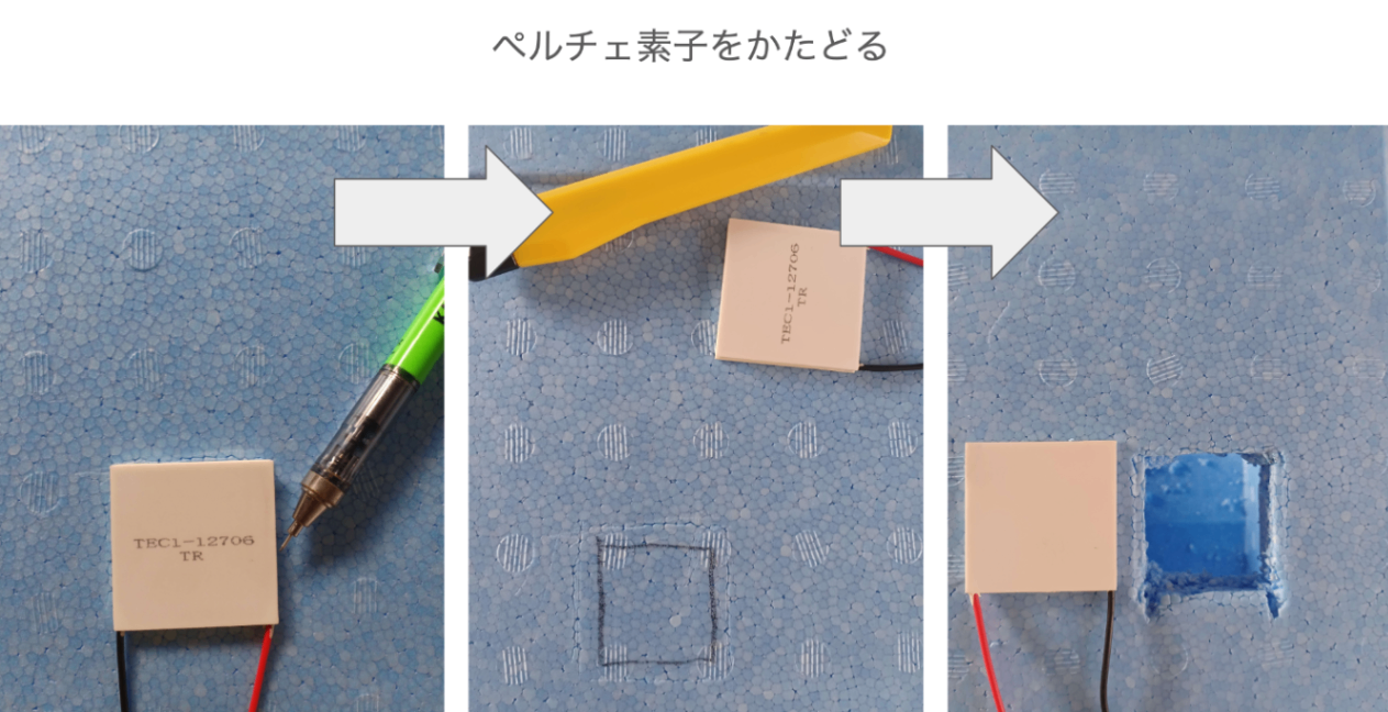 そして、箱に開けた穴との隙間は、ペルチェ素子の大きさに合わせて切り抜きます。