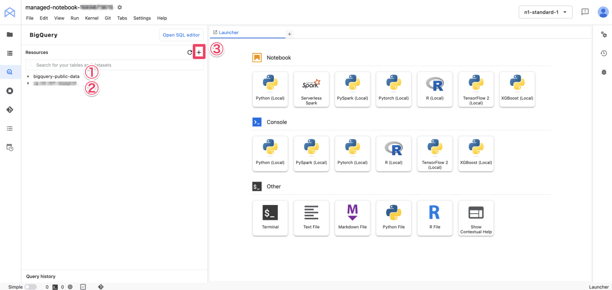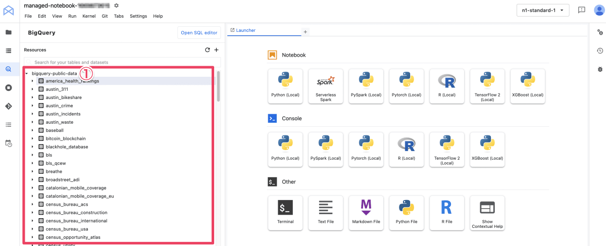 選択をするとBigQuery一般公開データセット①や、このノートブックのプロジェクト名②が表示されます。