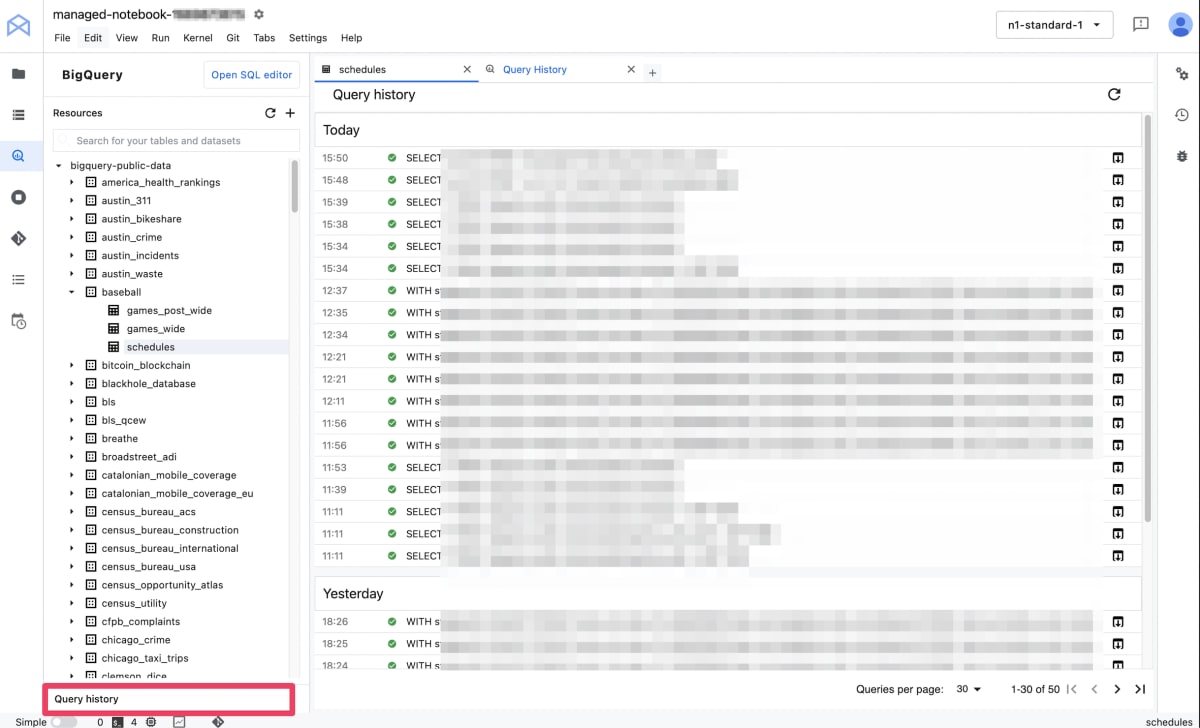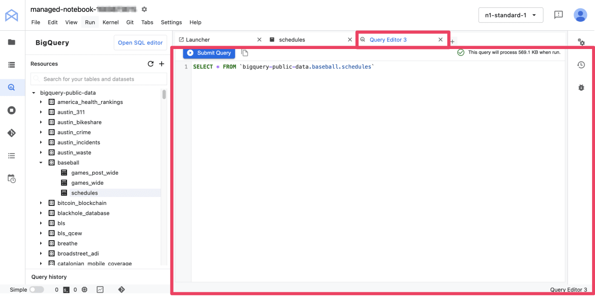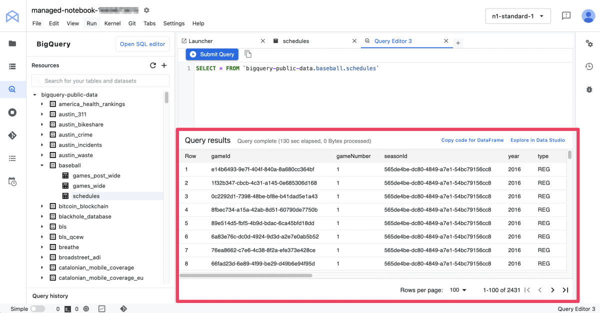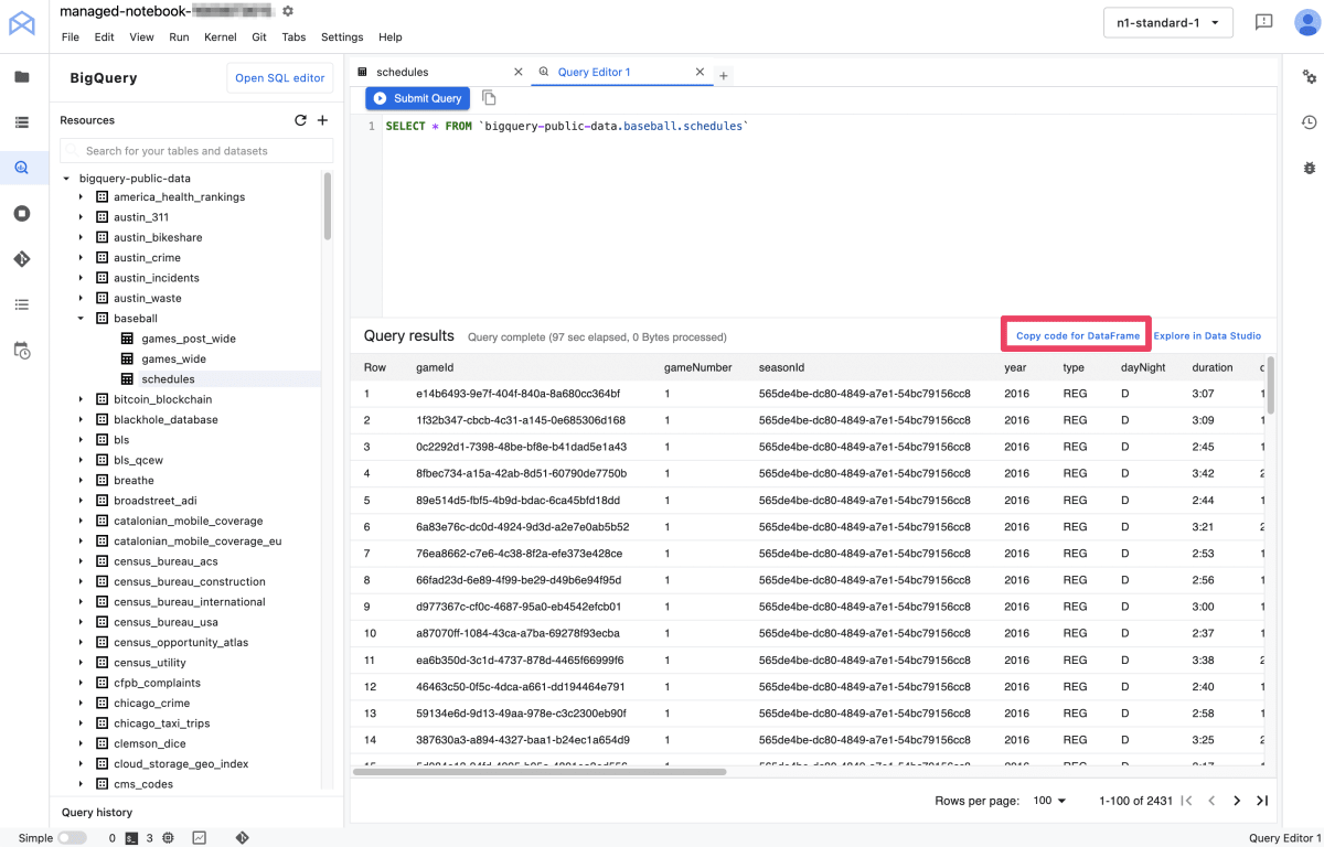 Python用のBigQueryクライアントライブラリをインポートし、ノートブックセルでクエリエディタと同様のクエリを実行し、pandasデータフレームとして出力するコードセグメントをコピーできます。