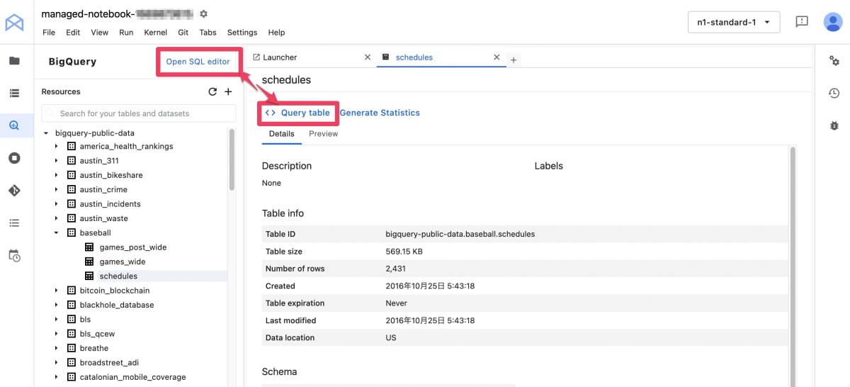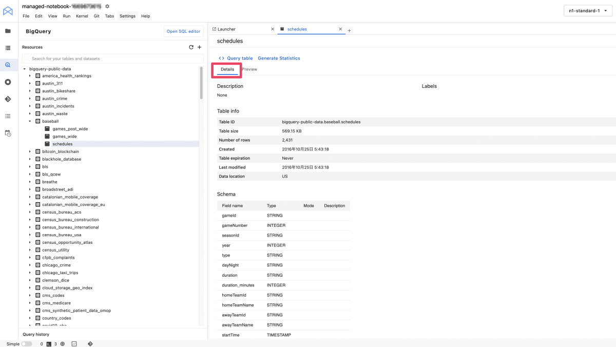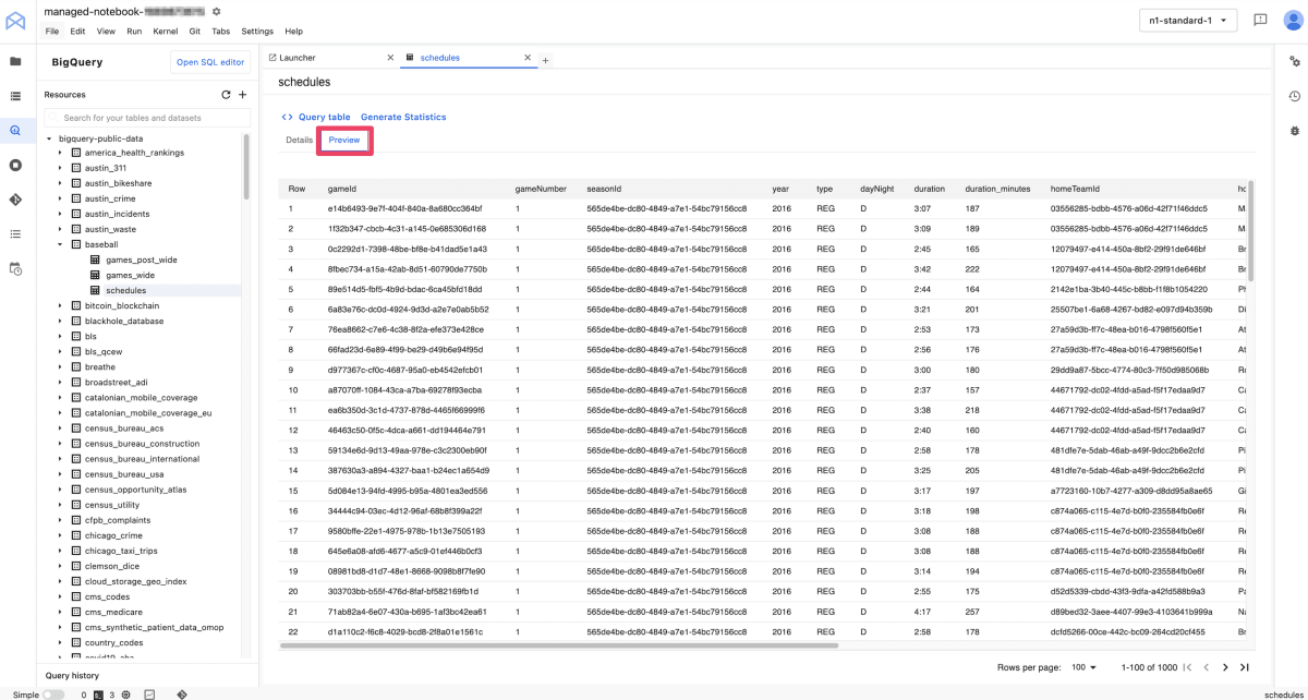 試しにbaseballデータセットのschedulesテーブルを選択します。