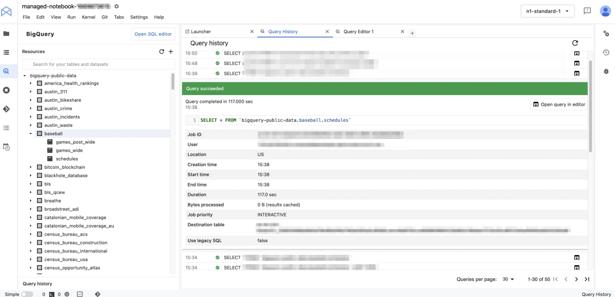 クエリエディタで1回、ノートブックセルで1回と合計2回同様のクエリを実行したことになりますが、2回目はキャッシュが使われているようです。
