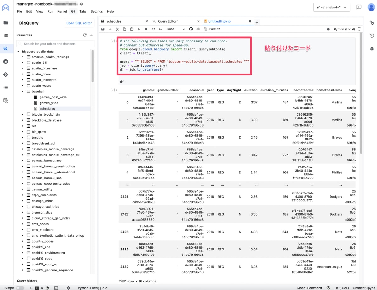 コピーしたコードをノートブックセルに貼り付け、実行してみます。クエリ結果がpandasデータフレームとして出力されました。