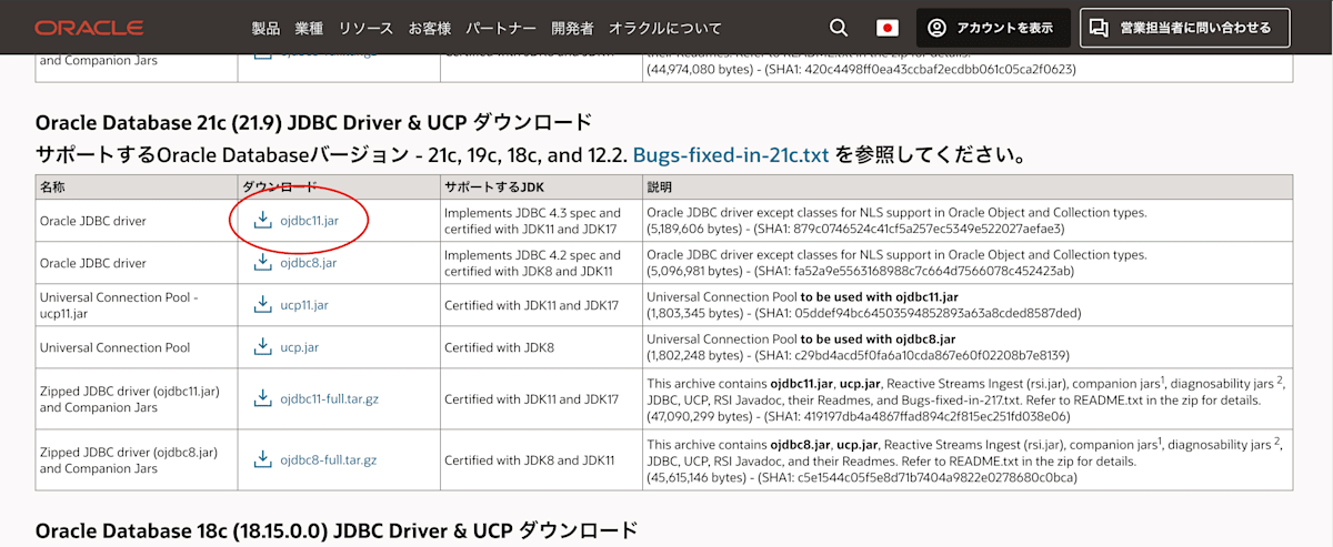 Oracle Database の JDBC driver ダウンロードページにアクセスして、ojdbc11.jar をダウンロードしてください。こちら後ほど使用します。