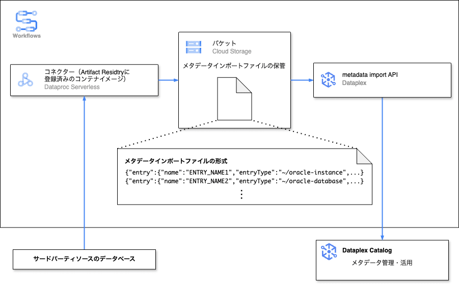 図の Workflows の処理で重要なのは、コネクター(コンテナイメージ)での処理と metadata import API による処理だと考えられます。コネクターでの処理は大まかに、