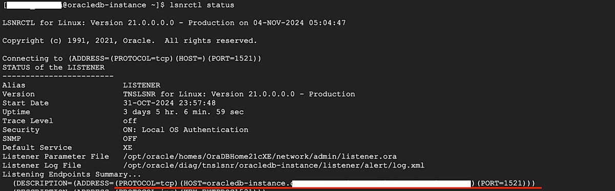 リスナーのステータスを確認するためには、SQL から exit で抜けたあと、lsnrctl status と入力します。