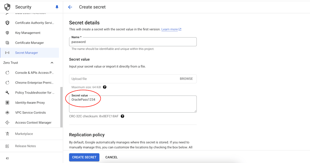 "ORACLE_PASSWORD": "projects/<YOUR_PROJECT_NUMBER>/secrets/password",
