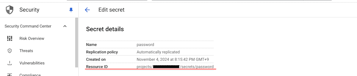 | "ORACLE_PASSWORD" | "projects/<YOUR_PROJECT_NUMBER>/secrets/<YOUR_SECRETS_NAME>" | Secret の Resource ID を入力。 |