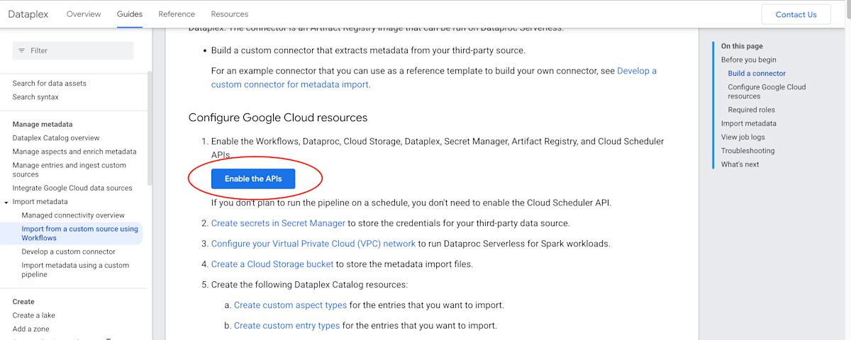 Workflows API、Dataproc API、Cloud Storage API、Dataplex API、Secret Manager API、Artifact Registry API、Cloud Scheduler API を有効化します。公式ドキュメントに必要な API をまとめて有効化できるボタンがあるのでそちらを踏んでいただくとスムーズかと思います。