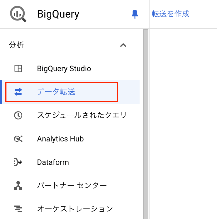 BigQuery のコンソールから「データ転送」を選択し、新しいデータ転送ジョブを作成します。