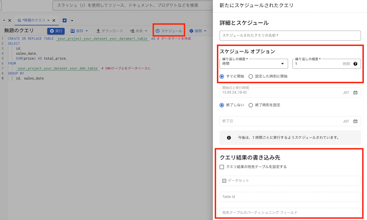 実行の頻度と上書き先のテーブル(今回作ろうとしているデータマート)の情報を埋めて設定します。
