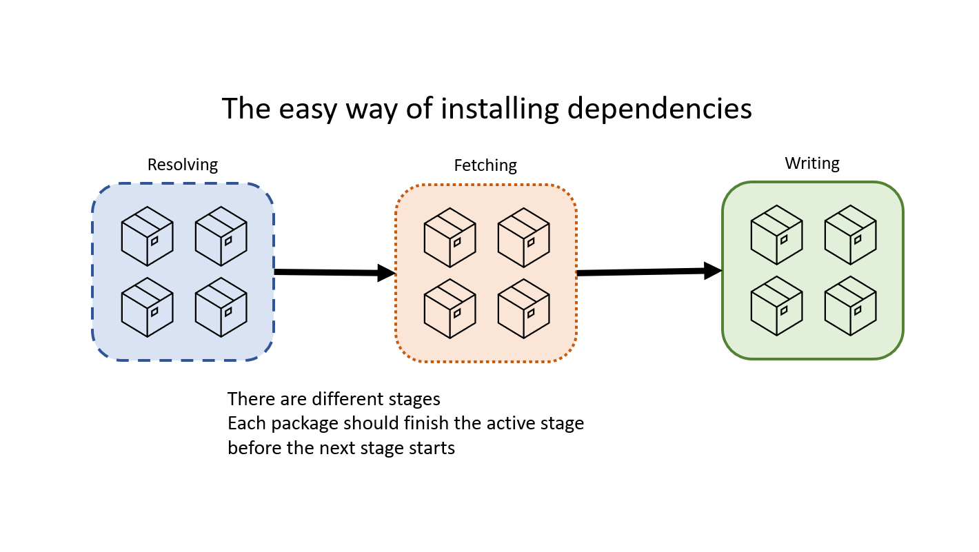 pnpm では、下の図のようにパッケージごとに個別にステージを実行することで、待ち状態を生み出さないようにし、インストールのプロセスを効率化しています。