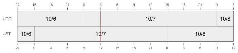 例えば、2024/10/07 12:00 (JST) は 2024/10/07 03:00 (UTC) ですので、日時を日単位で切り捨てるとどちらも 2024/10/07 です。