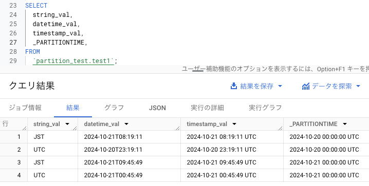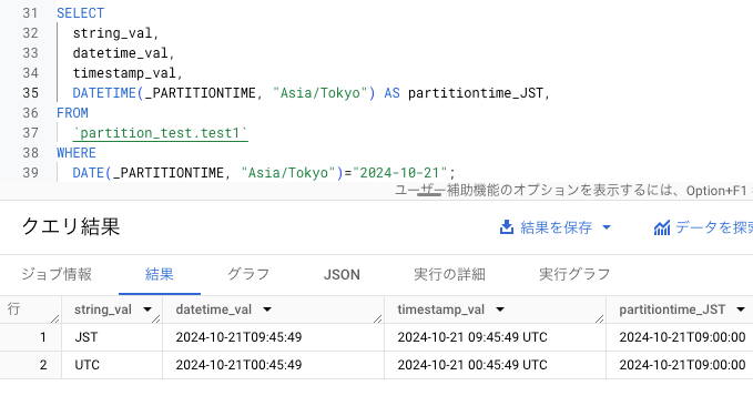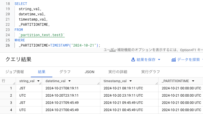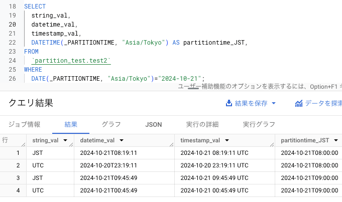 クエリ結果の partitiontime_JST をご覧ください。_PARTITIONTIME に対してタイムゾーン変更を施すと、"2024-10-21T09:00:00" のような値になります。これはパーティション時間が日単位で切り捨てられた上で 9 時間足されていることが原因です。そのため、正確なタイムゾーンの変更はできていません。