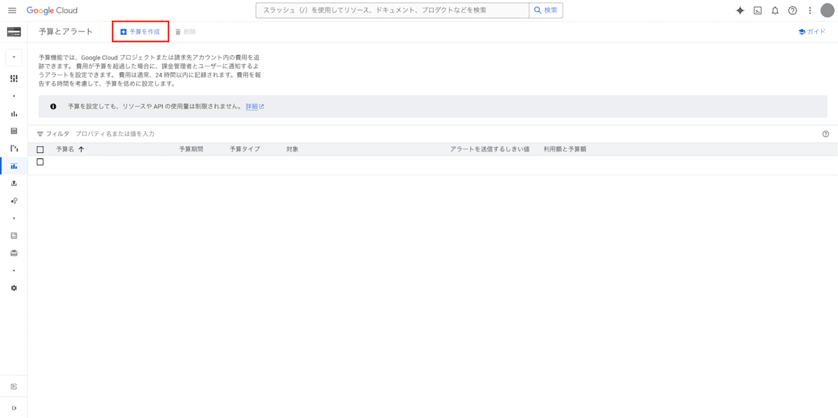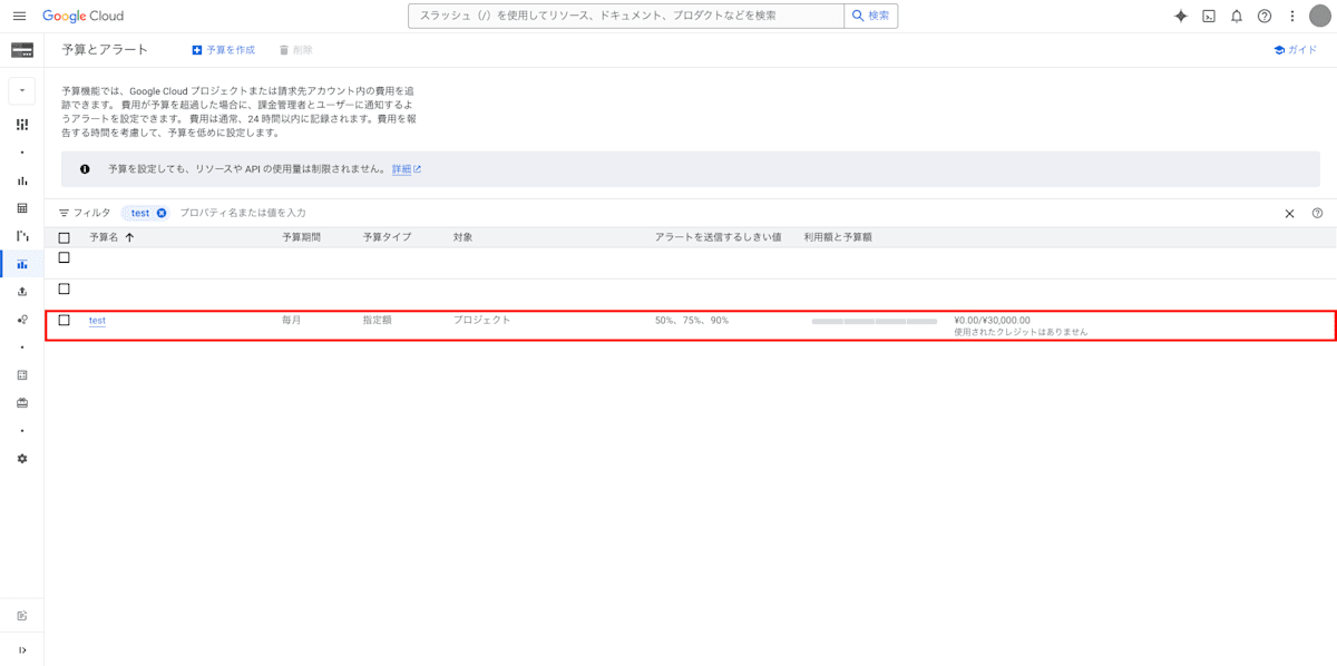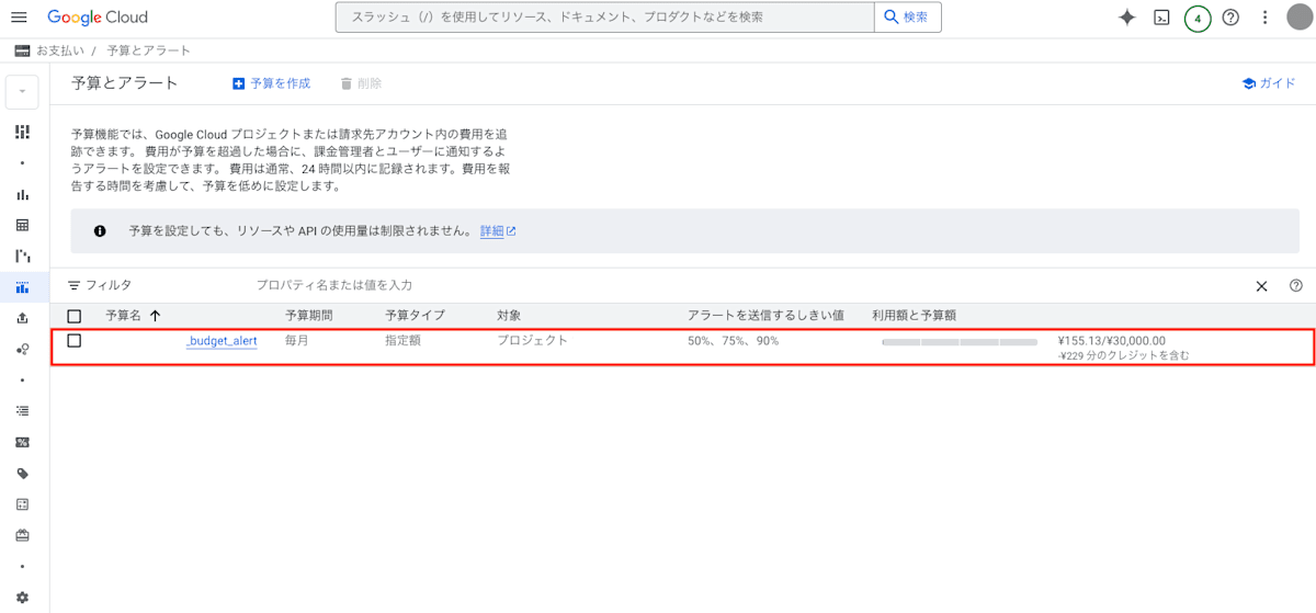 Google Cloud コンソールで、以下のように予算アラートが作成されていたら成功です。