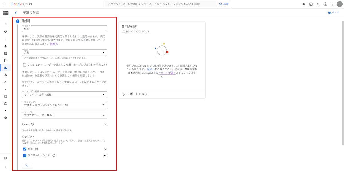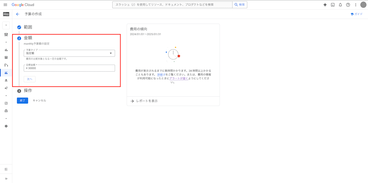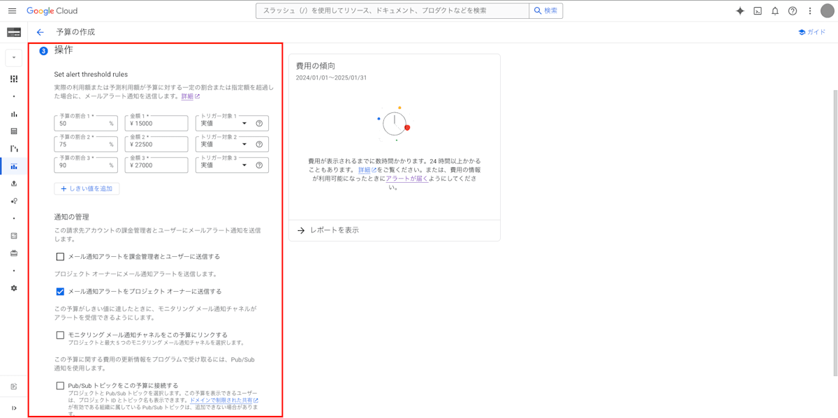 ただし、費用の記録には最大 24 時間の遅延があるため、アラートが発報された時点では、すでにさらに費用が発生している可能性があります。そのため、予算を低めに設定し、余裕を持たせ、想定以上の費用が発生するリスクを抑えることが推奨されています。