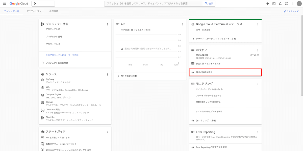 Cloud Billing は、Google Cloud 利用料金を確認できるサービスです。