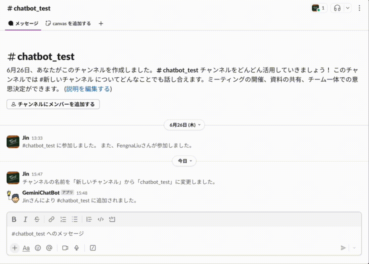 全ての準備が整ったら、Slack App を任意のチャンネルにインストールし、@<chatbot名>