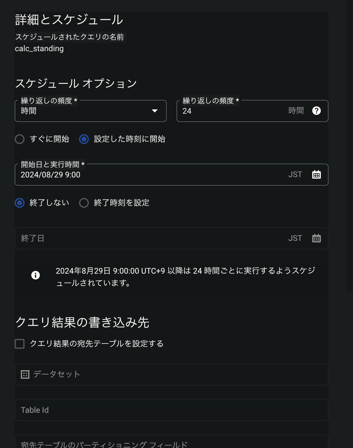 最後に、作ったクエリを Scheduled Query としてデプロイする必要がありました。