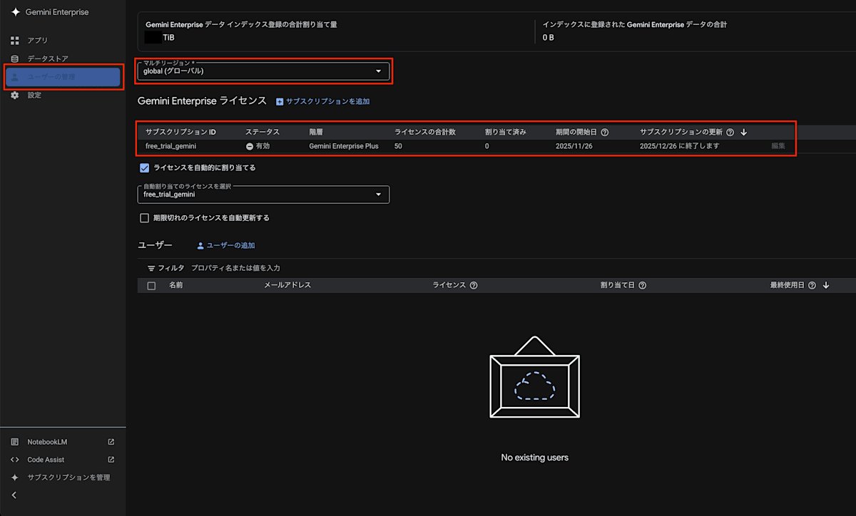 アプリの作成後に、「ユーザーの管理」設定を「global」リージョンで確認すると 「free_trial_gemini」 が追加されていることが確認できます。