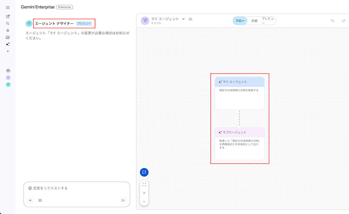 一例として、エージェント デザイナーで作成した下記エージェントは、現在日時を聞いたら自動で日本時間と西暦と年号をあわせて出力する簡単なエージェントになります。