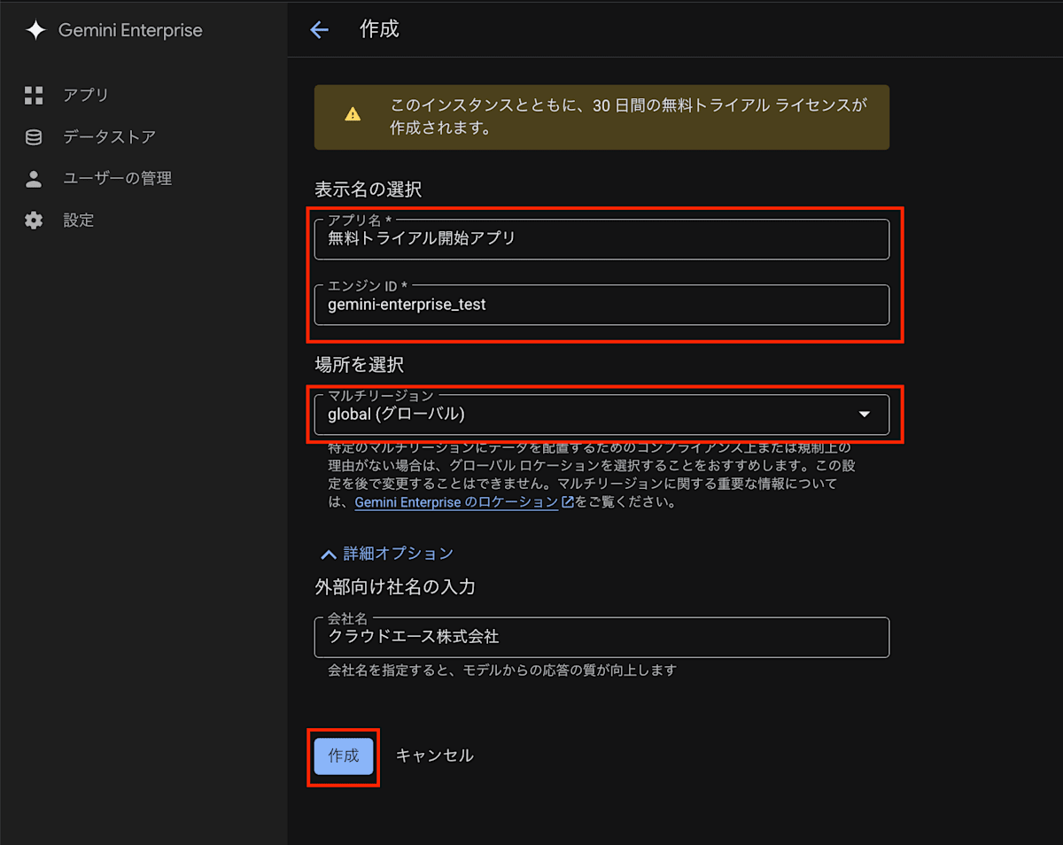 アプリの作成と同時に Gemini Enterprise の30日間の無料トライアルも開始されます。