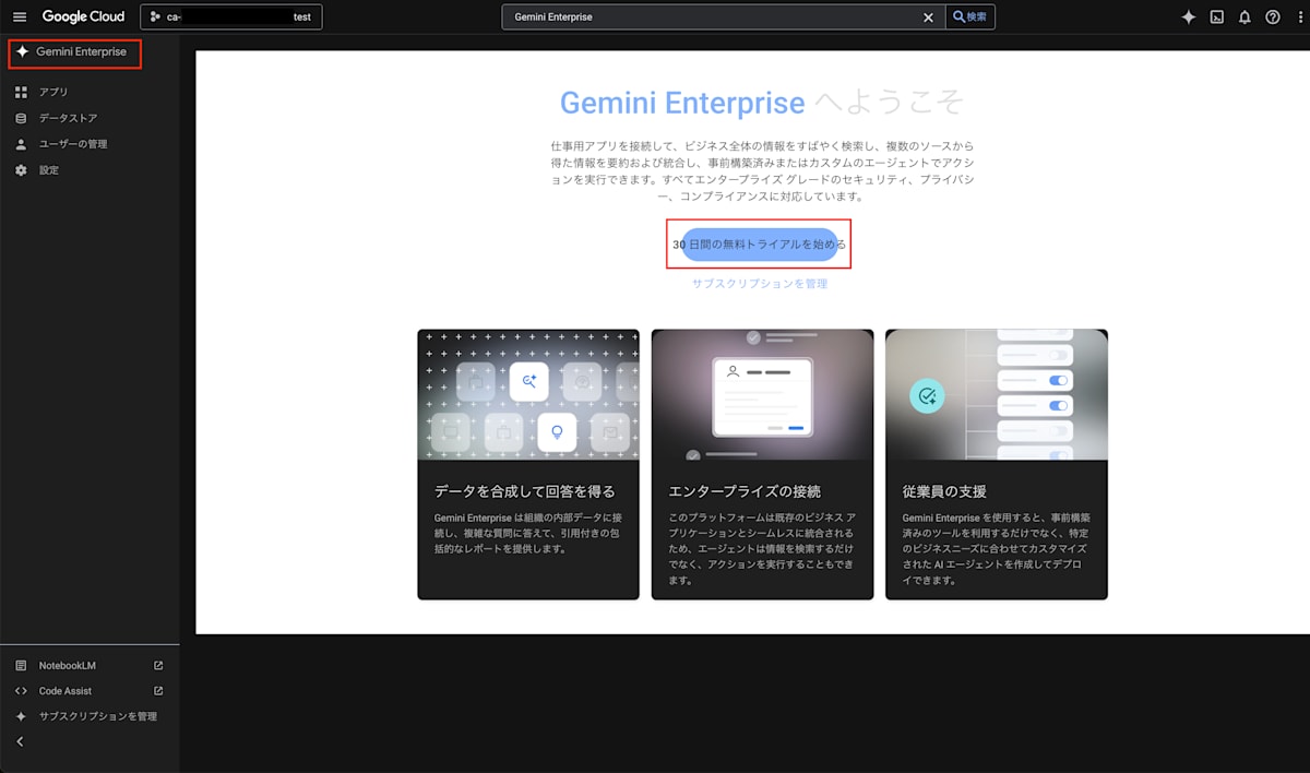この状態となっていれば、Gemini Enterprise の無料トライアルが開始できている状態となります。