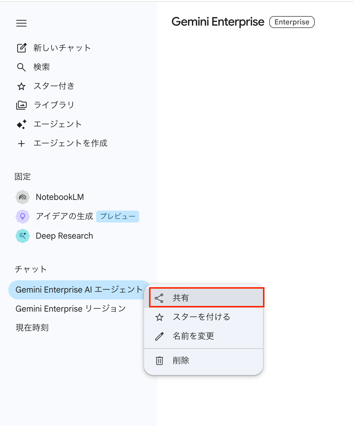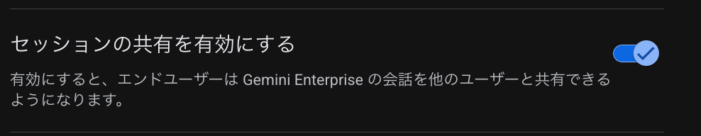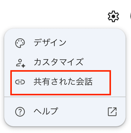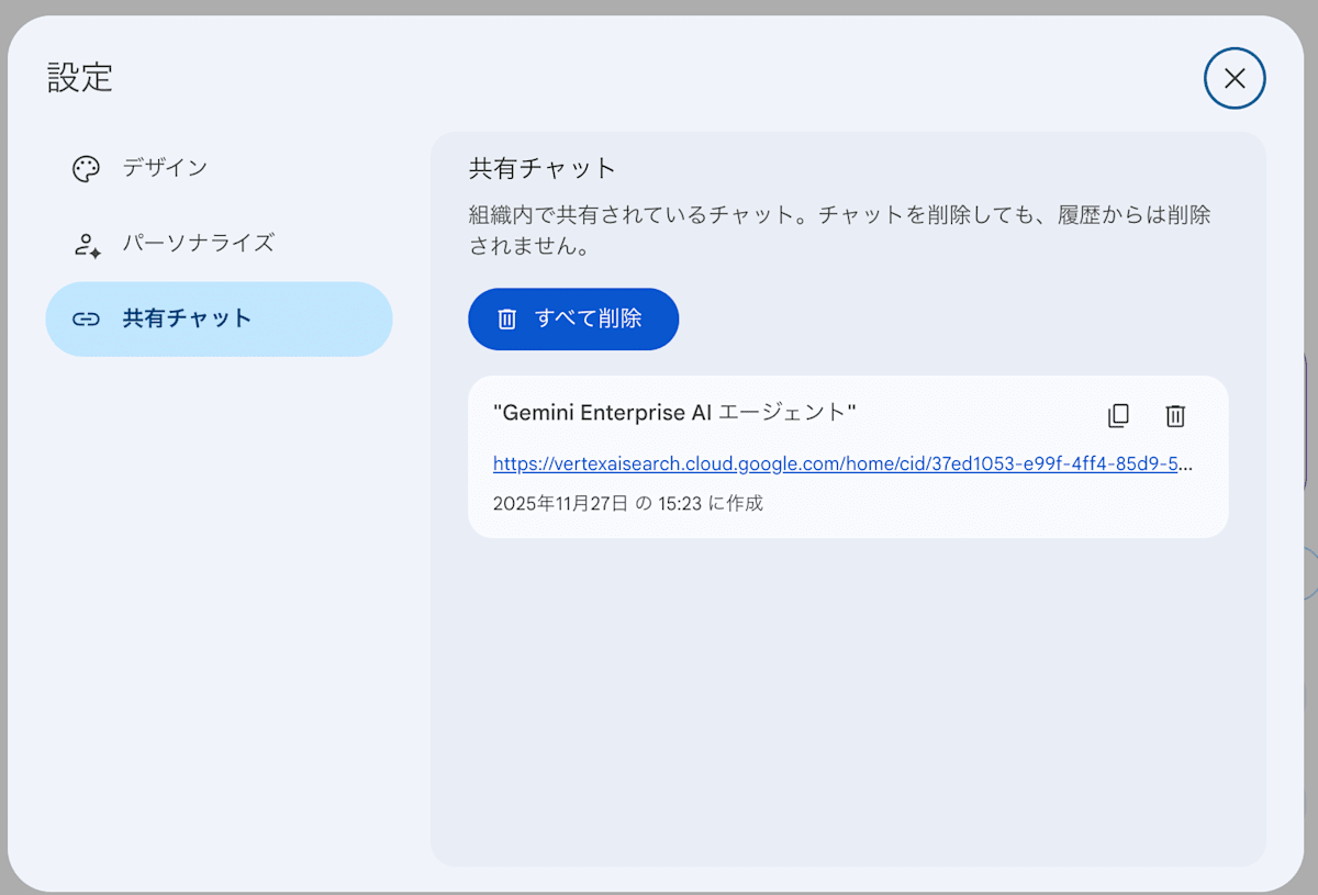 Gemini Enterprise アプリを利用して、過去のセッション(チャット)履歴の「⋮」から「共有」を選択します。