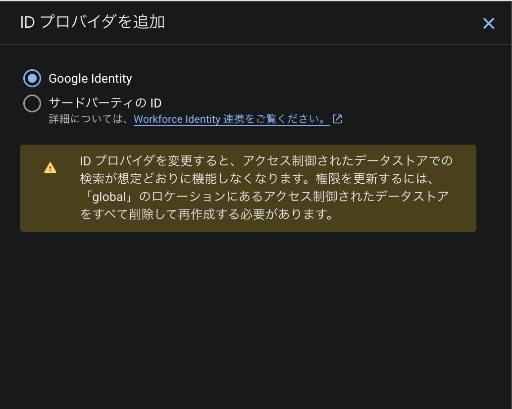 ※「サードパーティの ID プロバイダ」を選択する場合は、今回紹介する内容に加え、組織設定の Workforce Identity Federation の設定などが必要となります