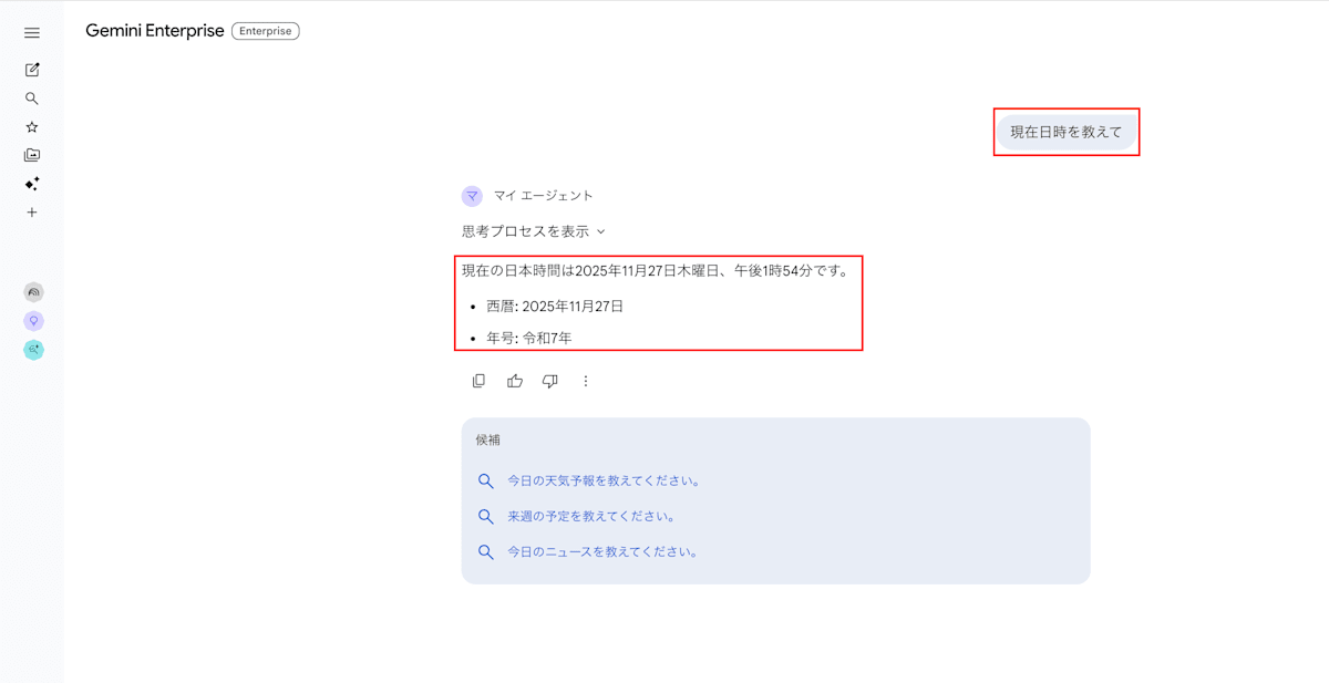 実際にこれまでの手順で作成した Gemini Enterprise アプリと「Google 検索」を使って機能紹介をしてみようと思います。