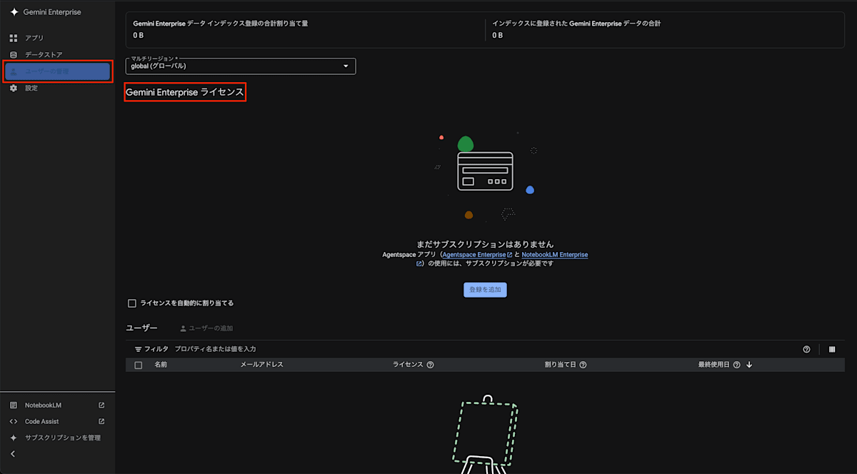 この時点で「ユーザーの管理」設定を確認すると、「global」リージョンには何もライセンスが存在していない状態となります。