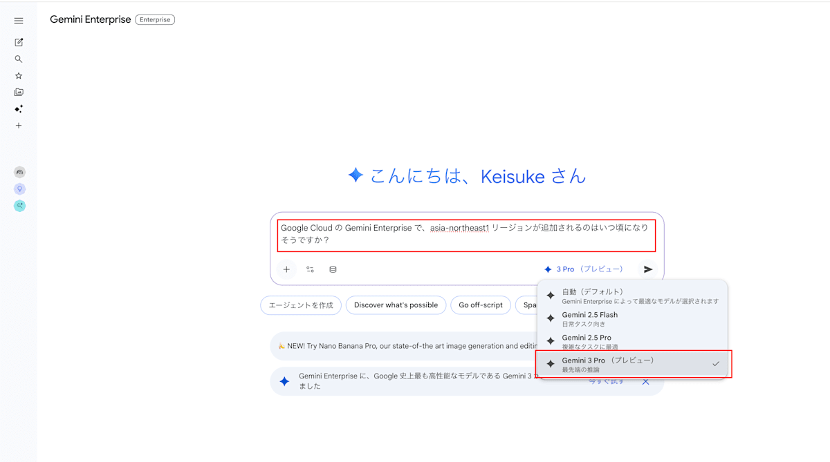 Google Cloud の Gemini Enterprise で、asia-northeast1 リージョンが追加されるのはいつ頃になりそうですか?