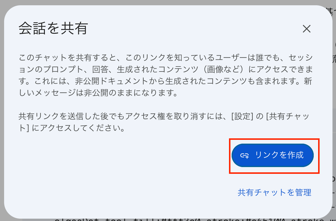 「共有」選択後に、下記画面となるので「リンクを作成」を押下します。