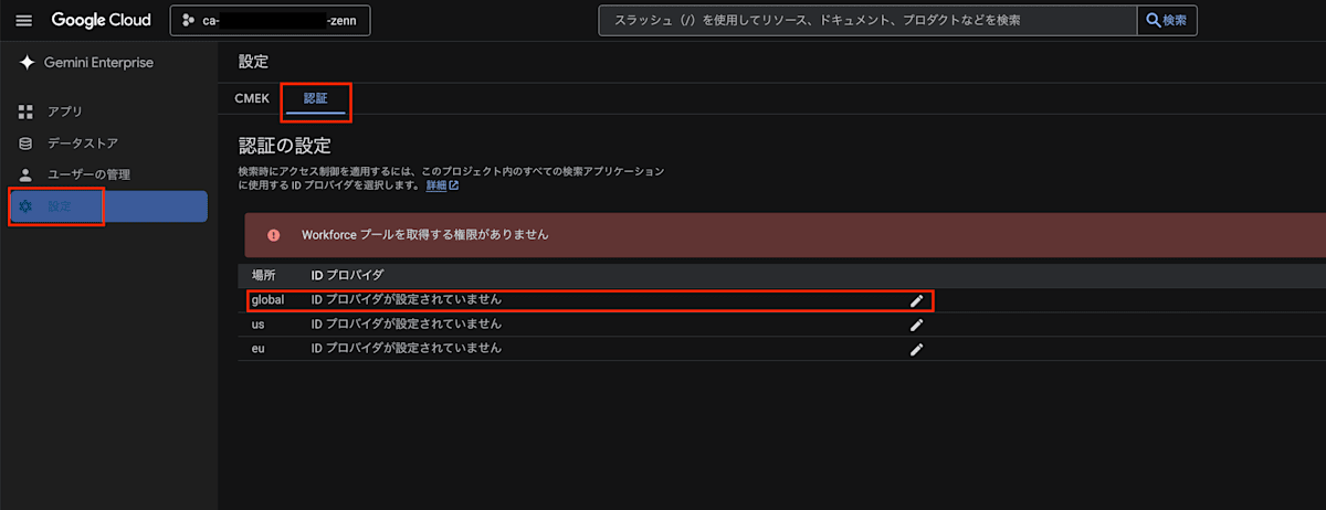 - Gemini Enterprise 設定で、認証を設定(global:Google Identity)