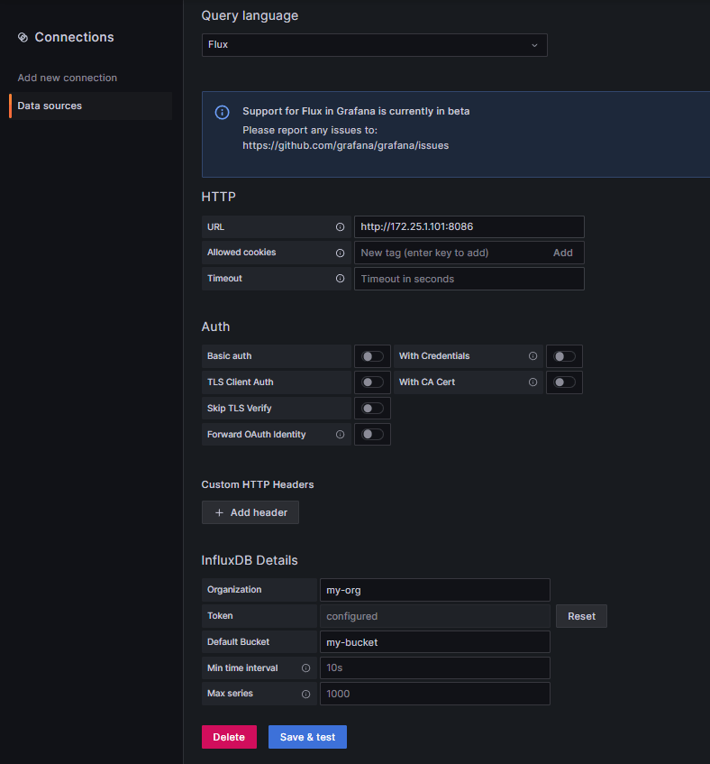 ブラウザからInfluxDBにアクセスする場合は、ホストの8086番ポートを通してInfluxDBのコンテナの8086番ポートにアクセスするため当然接続可能ですが、このURLの値に関してはgrafanaのコンテナ内からのアクセスになるため、http://localhost:8086とすると、grafanaのコンテナ内の8086番ポートへのアクセスとなりInfluxDBのコンテナに接続できません。この場合は、同一のdocker networkに属するコンテナ間の通信であるため、URLにはInfluxDBのコンテナのIPアドレス172.25.1.101の8086番ポートを指定することでデータ連携が可能になります。