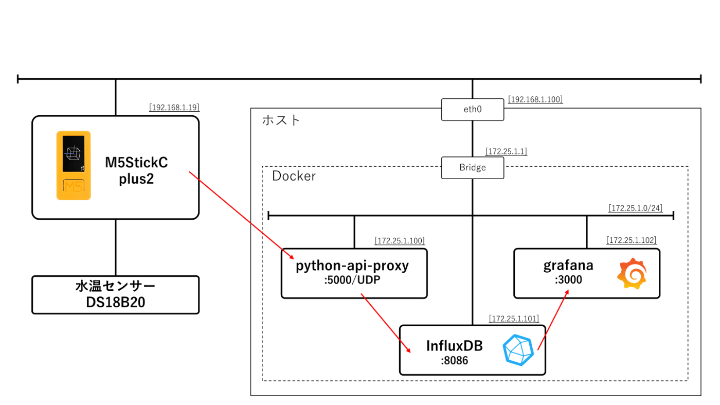 ・水温センサーから取得した値をM5StickC plus2からUDPでpython-api-proxyに送る