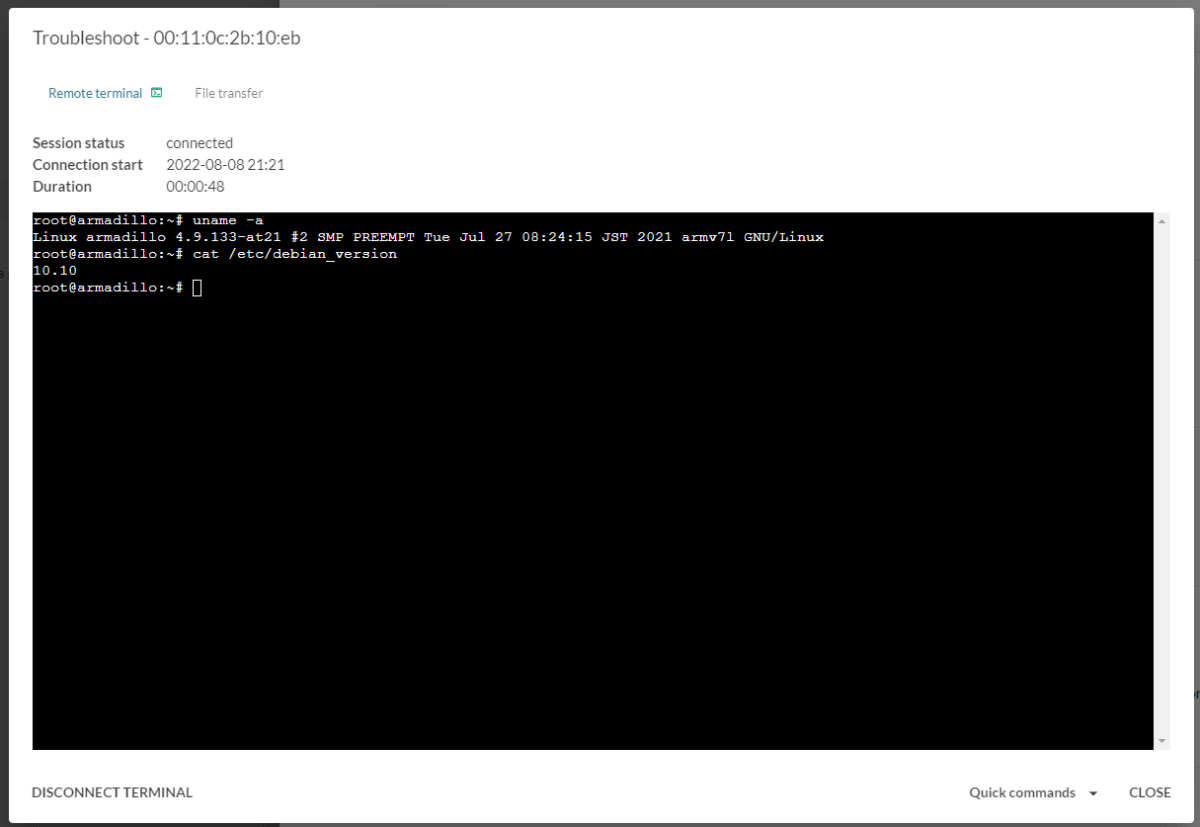 表示されるデバイス詳細画面の一番下にある Launch a new Remote Terminal session をクリックすると、リモートターミナルがブラウザ内で実行開始されます。実行終了するときは CLOSE ボタンを押します。
