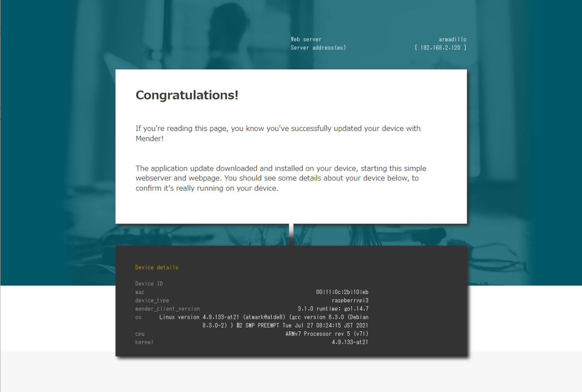 第4回記事 でやっていたのと同様に、mender.ioにあらかじめ登録されている mender-demo-artifact をこのArmadillo IoT G3デバイスに配信することが可能です。