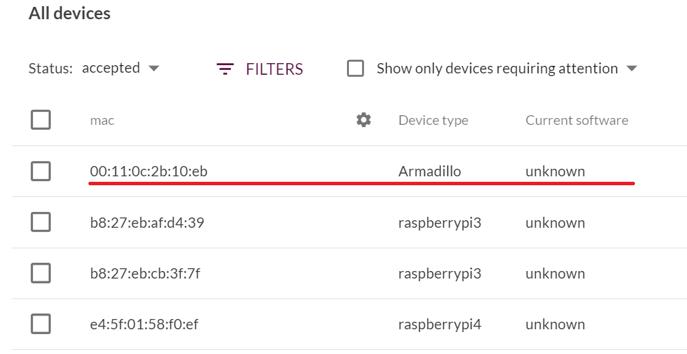 DEVICES画面で Status: フィルタを accepted に変更すると、これまでに接続承認したデバイスが一覧表示されます。ここからDevice Typeが raspberrypi3 のデバイスから、実際には Armadillo IoT G3 の行を見つけてクリックします。 (macアドレスなどで確認可能です)