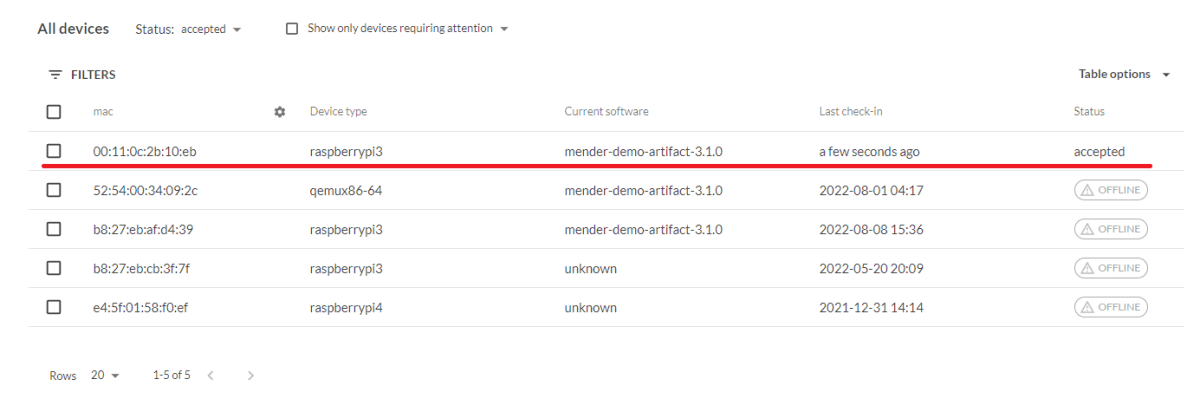 これでArmadillo IoT G3デバイスが mender.io と接続されました。